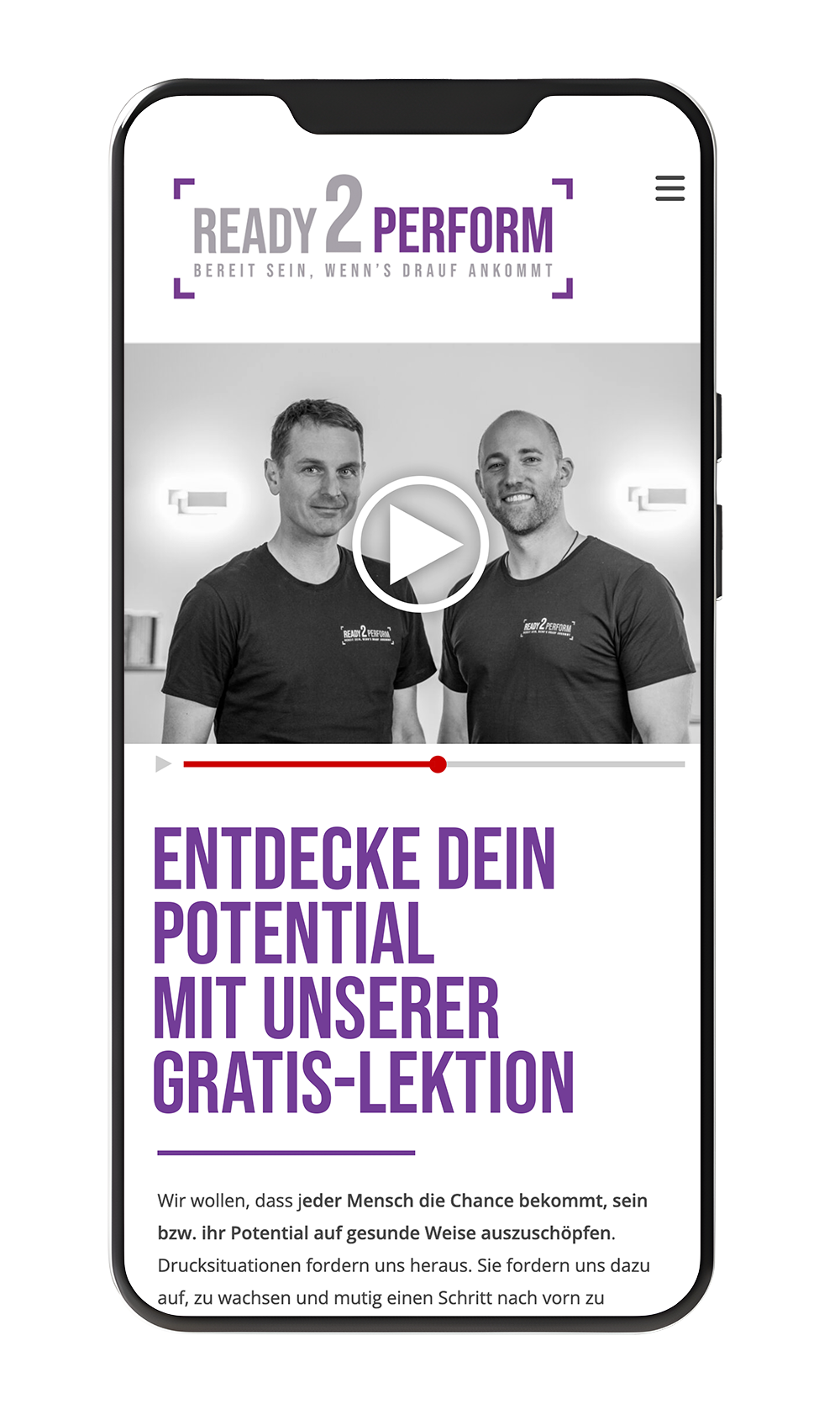 Erhalte einen Einblick in den Kurs und sichere Dir die erste Video-Lektion gratis. Einfach Anmeldeformular ausfüllen – ganz ohne Kosten und ganz ohne Risiko. Sei bereit, wenn’s zählt – mit Ready2Perform.